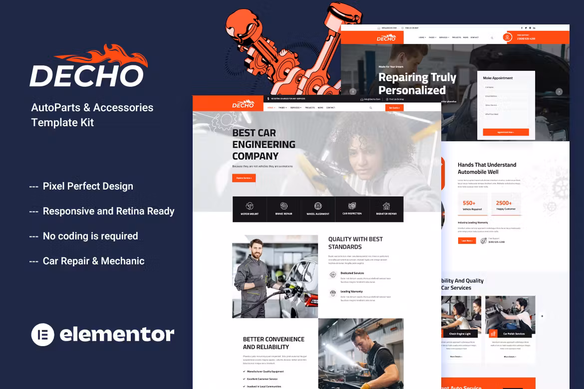 Decho is a Template Kit specially for Car Service, Car Repair Company, Service Company, and Car Easy Solution Services. The Car Service & Repair template has a beautiful and unique design that will be best suited for your online web presence. Installation and using theme are easy with Elementor , all you need just drag and drop and replace the image and the content within the kit. No code required to modify this theme