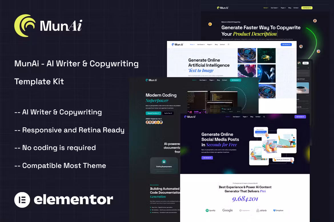 MunAi – AI Writer & Copywriting Template Kit is an Elementor Template Kit ideal for AI Writer, Copywriting, OpenAI Content Generator, or AI Content Writing website.